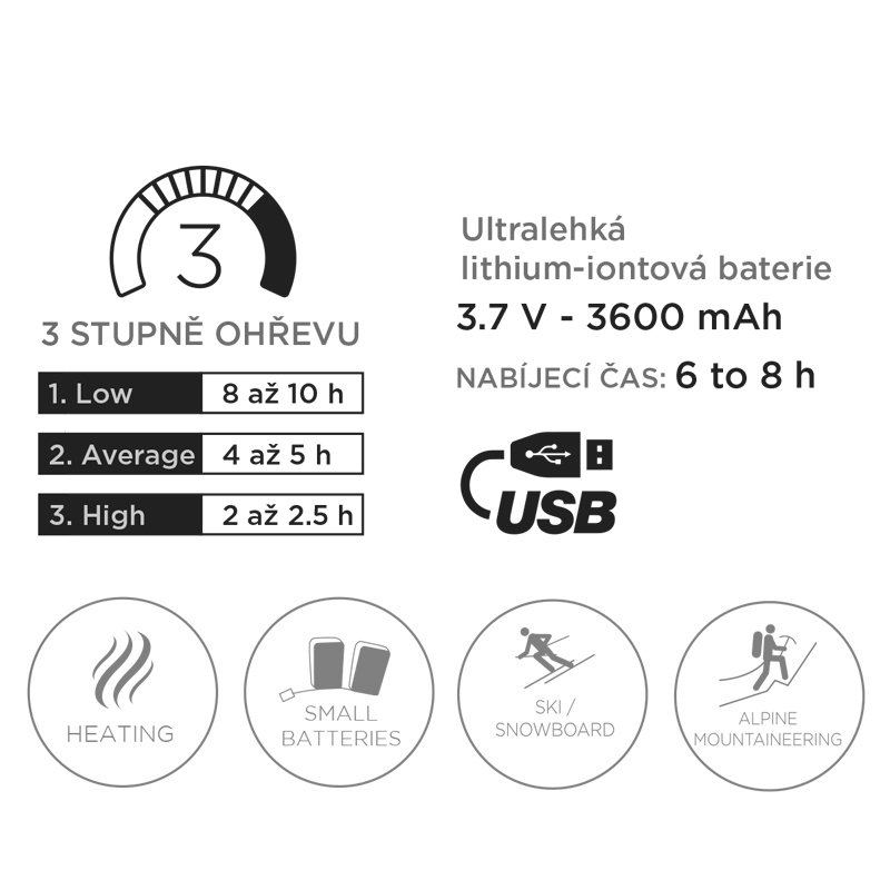 Vyhrievané pánske rukavice s PRIMALOFT a DRYZONE technológií zaručujúce perfektnú izoláciu proti chladu a nepremokavosť. 3 stupne ohrevu, ktoré sa nastavujú jediným tlačidlom. Batérie dodávajú teplo až 10 hodín. USB napájací kábel je súčasťou balenia. Napájací adaptér nie je súčasťou balenia.